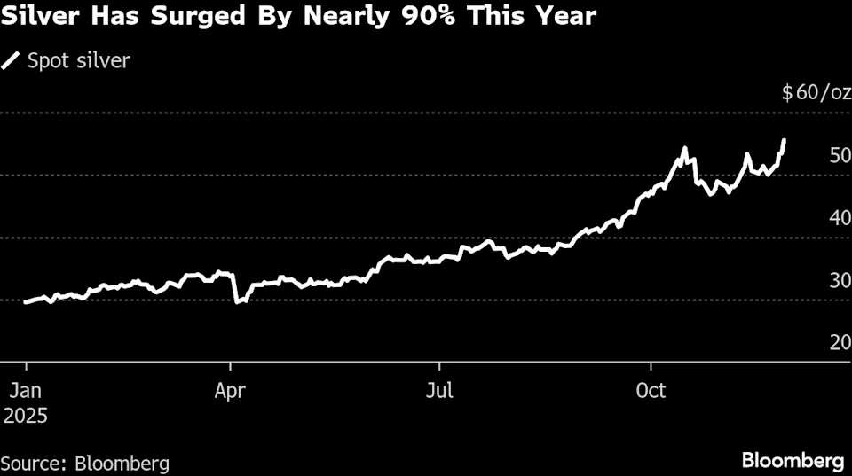 Spot prices surged as much as 4.2% to about $55.66 an ounce. The white metal has been supported by rising hopes of a Federal Reserve interest-rate cut in December, inflows into bullion-backed exchange-traded funds and ongoing supply tightness.